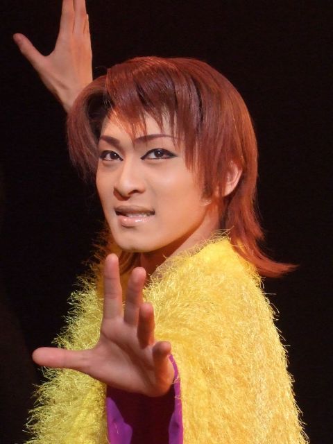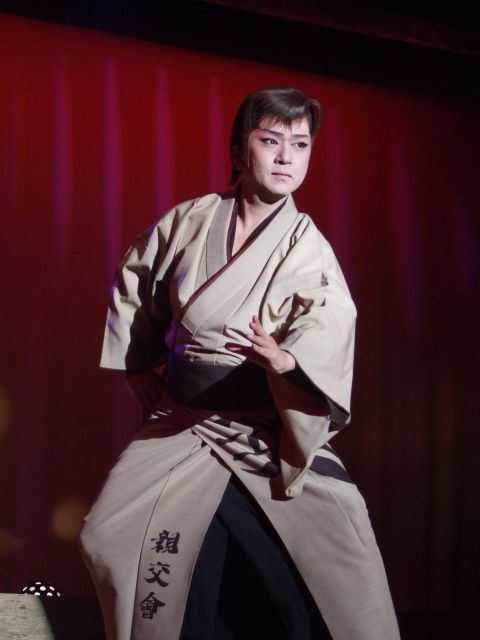 23日夜の部 ラスト ファンより桜春之丞座長襲名三周年記念ケーキのプレゼント。バックは、(左より)小桜顕、小桜京、小桜真