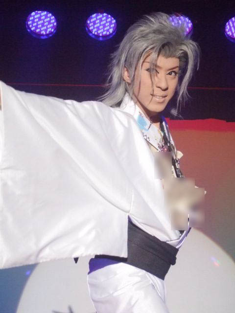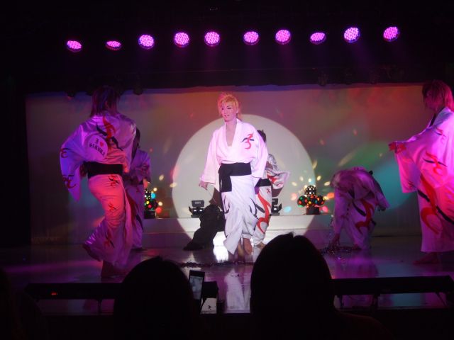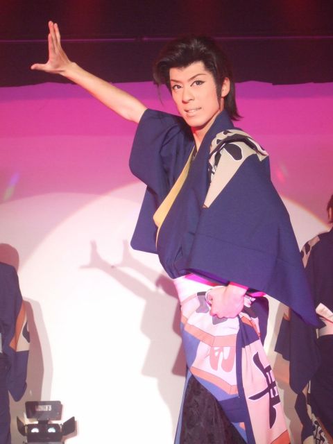 舞踊ショー・オープニング、桜春之丞座長。クラッカーのテープで全然見えませんが(笑)。